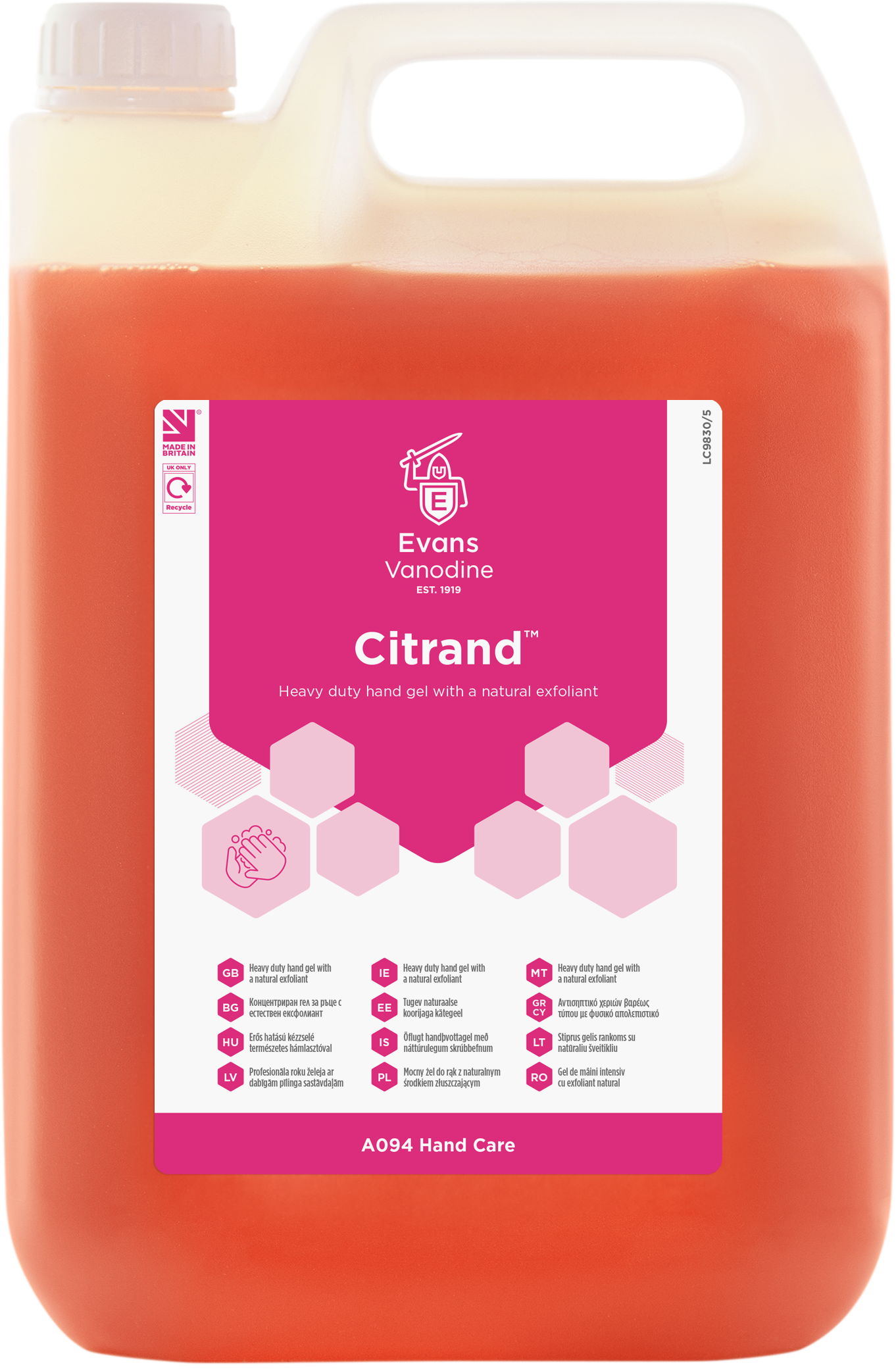 Perfumed hand cleaning gel with a natural, mild, exfoliant. Quickly and easily removes ingrained oil, grease, grime and everyday industrial soiling. •Manufactured with sustainably sourced olive seed, a by-product of olive oil production. •Refreshing, citrus fragrance makes it pleasant to use. •Rinses off easily in warm or cold water. •Solvent free. •Ideal for use in garages, engineering workshops, warehouses, builders yards, construction sites and all general industry. •Suitable for use through the Evans Evolve bulk dispenser or directly from the 5 L container using a pelican pump. •A wall bracket is available to fit the 5 litre container.