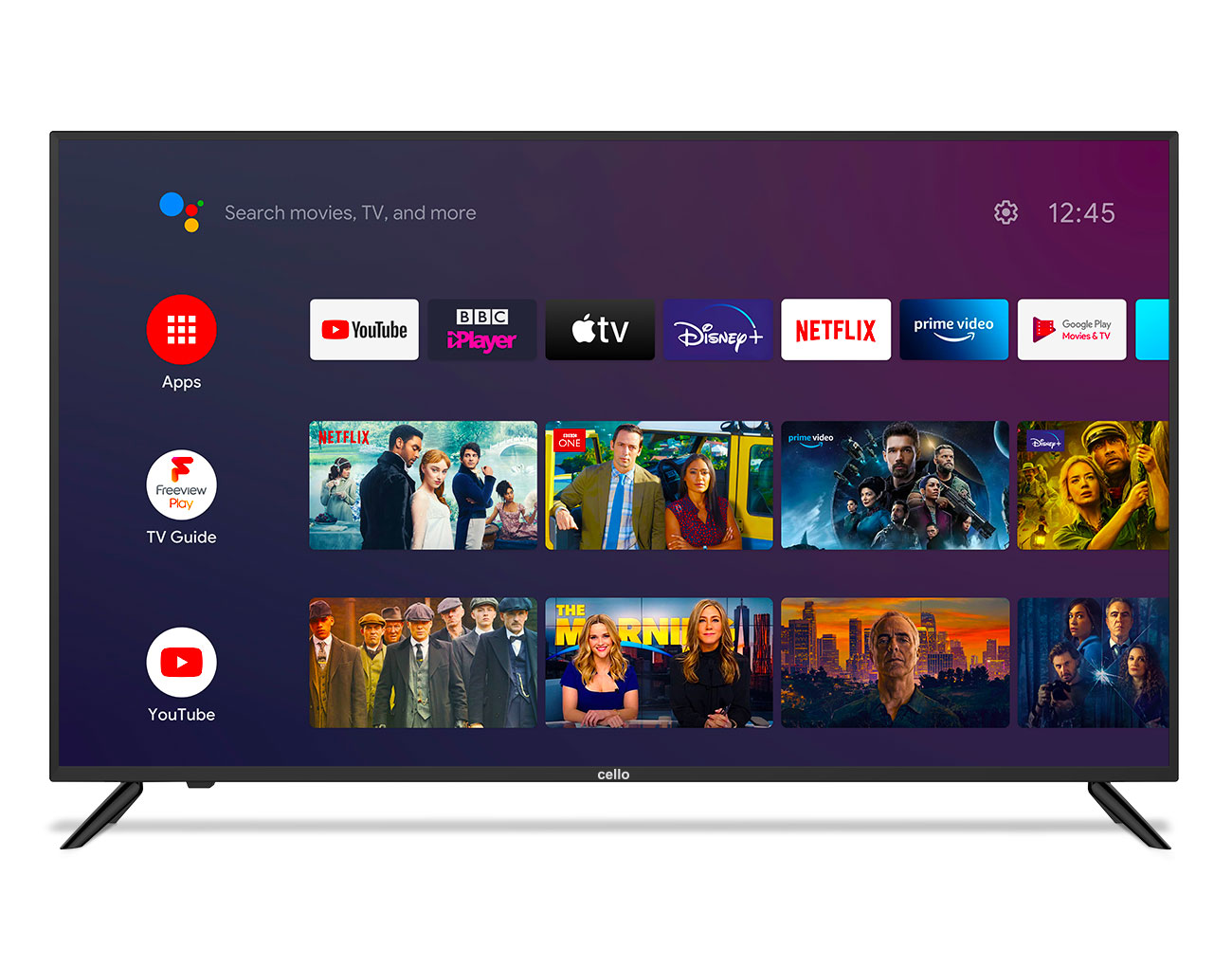 Cello Electronics is a UK-based manufacturer known for producing high-quality televisions and electronic goods. They specialise in designing and assembling their products in the UK, offering a range of smart TVs, LED TVs, DVD players, sound bars, and a wide variety of home electronics and appliances such as kettles, toasters, microwaves, and air fryers, all with a focus on innovation and affordability. SMART SYSTEM - 100% faster than main rivals. In tests, the Smart platform is proven to be 100% faster to load and play than other mainstram Smart TV’s. FREEVIEW - 60,000 hours of free TV on demand. The nation’s most popular TV platform offers an impressive 60,000+ hours of TV and over 1,500 boxsets, across your favourite on demand players. BLUETOOTH - Easily connect a Bluetooth device. Stream audio from your TV to your wireless speaker, soundbar, or headphones and enjoy high quality sound without the need for untidy cables. Specifications: Built-in satellite tuner & freesat | - Features LG’s Smart operating system | - 3 x HDMI inputs for devices and consoles | - Wall Mountable Please note that this Smart TV features third-party Apps. These Apps may be modified or withdrawn at any time. There may also be a delay in launching some of the featured Apps. Catch-up TV Apps may vary by region. The function and availability of Apps are not the responsibility of the TV manufacturer.