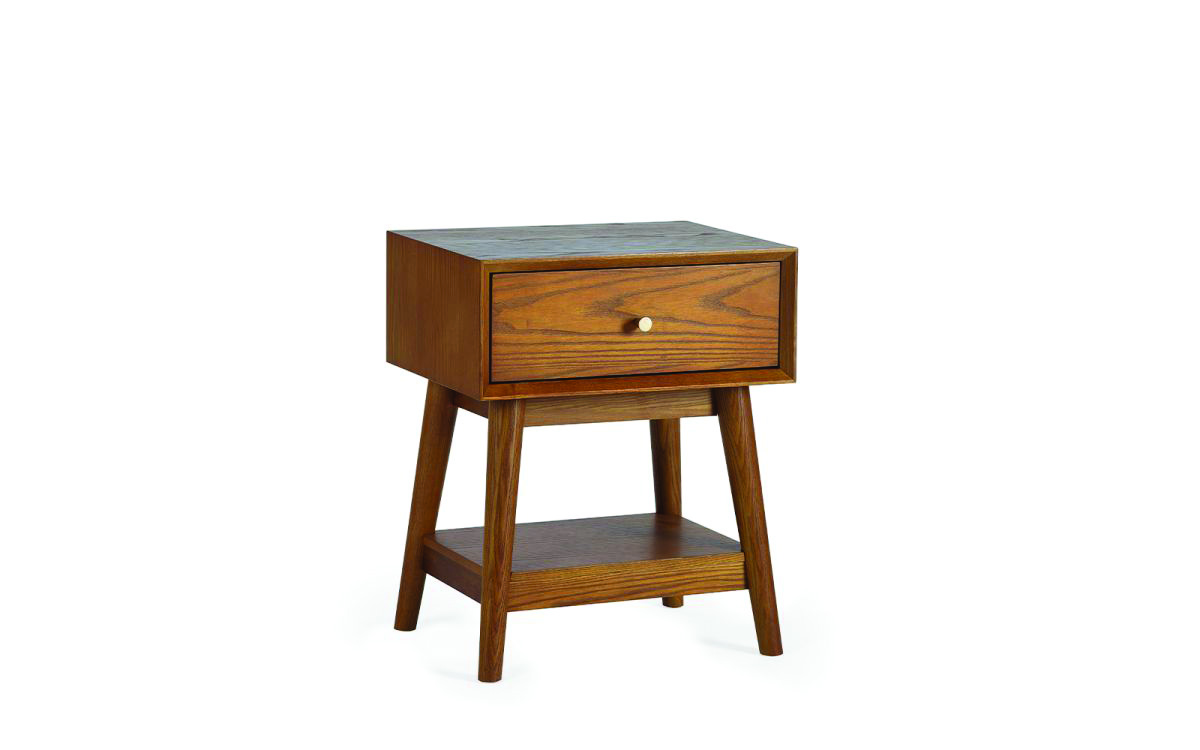 Constructed from cherry ash wood veneer with tapered legs and a golden knob, this table offers both style and functionality with its single drawer and storage shelf. It’s a perfect accent piece, adding character to any room. H55 x W45 x D33cm