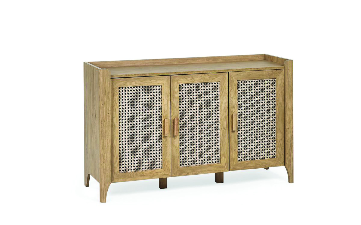 Showcasing a beautifully sleek design with a bohemian feel, the Sydney 3 Door Sideboard offers exquisitely curved edging accompanied by a raised lip around the edge providing a practical addition, stunningly combined with a rattan effect front. Finished with a natural oak effect featuring three cupboards with built-in shelving allowing you to store key necessities plus extra space on top to place ornaments. All around creating the perfect airy, warm feel within your home.