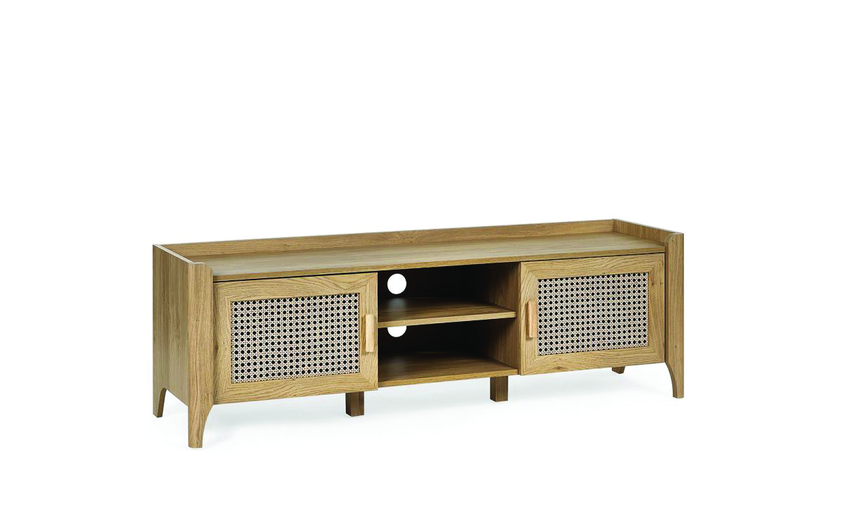 Showcasing a beautifully sleek design with a bohemian feel, the Sydney Media Unit offers exquisitely curved edging accompanied by a raised lip around the edge providing a practical addition, stunningly combined with a rattan effect front. Finished with a natural oak effect which is composed of two large storage cupboards and built-in shelving providing you plenty of space for controllers and TV monitors. All around creating the perfect airy, warm feel within your home.