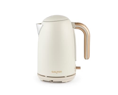 Upgrade your kitchen with the stylish Salter Pebble Kettle, featuring a 1.7 L capacity and a powerful 3000 W fast boil system so you’re never waiting for your morning brew! It comes with a removable limescale filter for cleaner water and a convenient swivel base. Monitor boiling progress through the blue indicator light, water level indicator, and handy viewing window. Finished in chic cream and gold, this kettle effortlessly combines elegance with efficiency for your daily beverage needs.