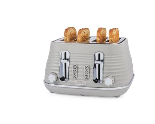 Enjoy the perfect slice of toast every time with the Salter Ripple 4-Slice Toaster. Featuring 6 browning levels and wide slots for bagels and crumpets, you can enjoy a selection of treats cooked exactly how you like them. Offering a defrost, reheat, and cancel function, you can take full control over your cooking whilst the self-centring guides do their part in ensuring it’s evenly cooked. Featuring a taupe textured ripple design, this toaster adds warmth and elegance to any kitchen countertop.