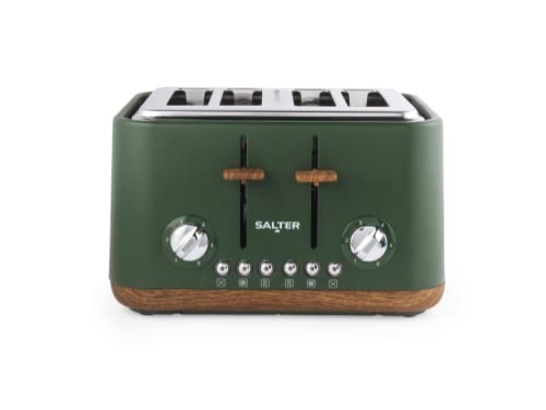This Salter Toronto 4-Slice Toaster brings a modern and stylish edge to your kitchen worktop. Featuring six levels of browning to meet your preferences and extra wide slots allow you to easily fit thick slices of bread, crumpets, teacakes and bagels. With defrost, reheat and cancel functions to make your life easier, the removable crumb tray and high-lift ejector function makes for quick and easy cleaning, while the self-centring function helps keep your food perfectly aligned for even toasting.