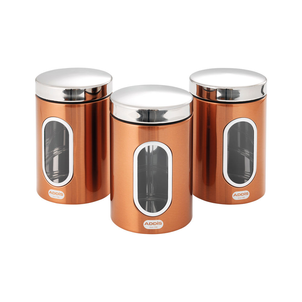 A stylish canister set by Addis. This set of three air tight canisters is ideal for storing all types of dried food including tea, coffee, sugar as well as items such as pasta and flour. The copper finish, combined with the contrasting silver lids and windows make them easy to storage items without the need of labels. A great addition to many interior designs. Size: 15 x 34 x 18cm Capacity: 1.4 litres (each)