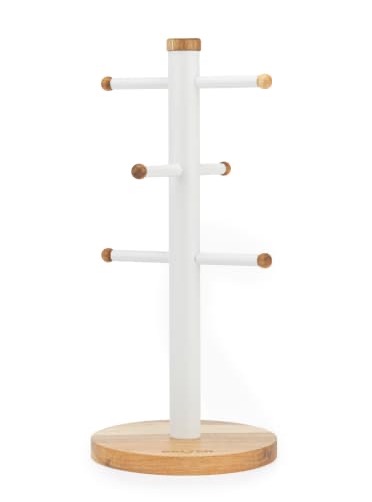 The Salter Toronto Mug Tree combines the elegance of acacia wood with the durability of steel. This stylish 3-tier rack provides a convenient storage option for up to 6 mugs, offering easy-grab access to your favourite cups – right on the countertop! Say goodbye to cluttered cupboards as this space-saving item frees up valuable storage space. Designed in white, it not only organizes your mugs but also adds a touch of sophistication to any countertop. Simple to maintain, just wipe clean with a soft, damp cloth.