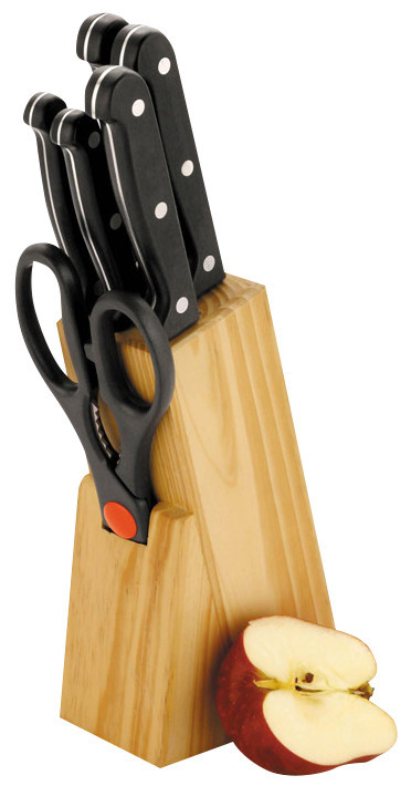 The six piece knife set in wooden block is a fantastic addition to a kitchen, filled with a great selection of stainless steel knives and scissors, this knife block will provide guests with all the basic knives they may need to cook up a storm in their holiday accommodation while keeping them stored safely in the wooden block. The six piece set includes the following knives; Paring knife Utility knife Carving knife Cooks knife Vegetable knife Pair of scissors Dishwasher safe.