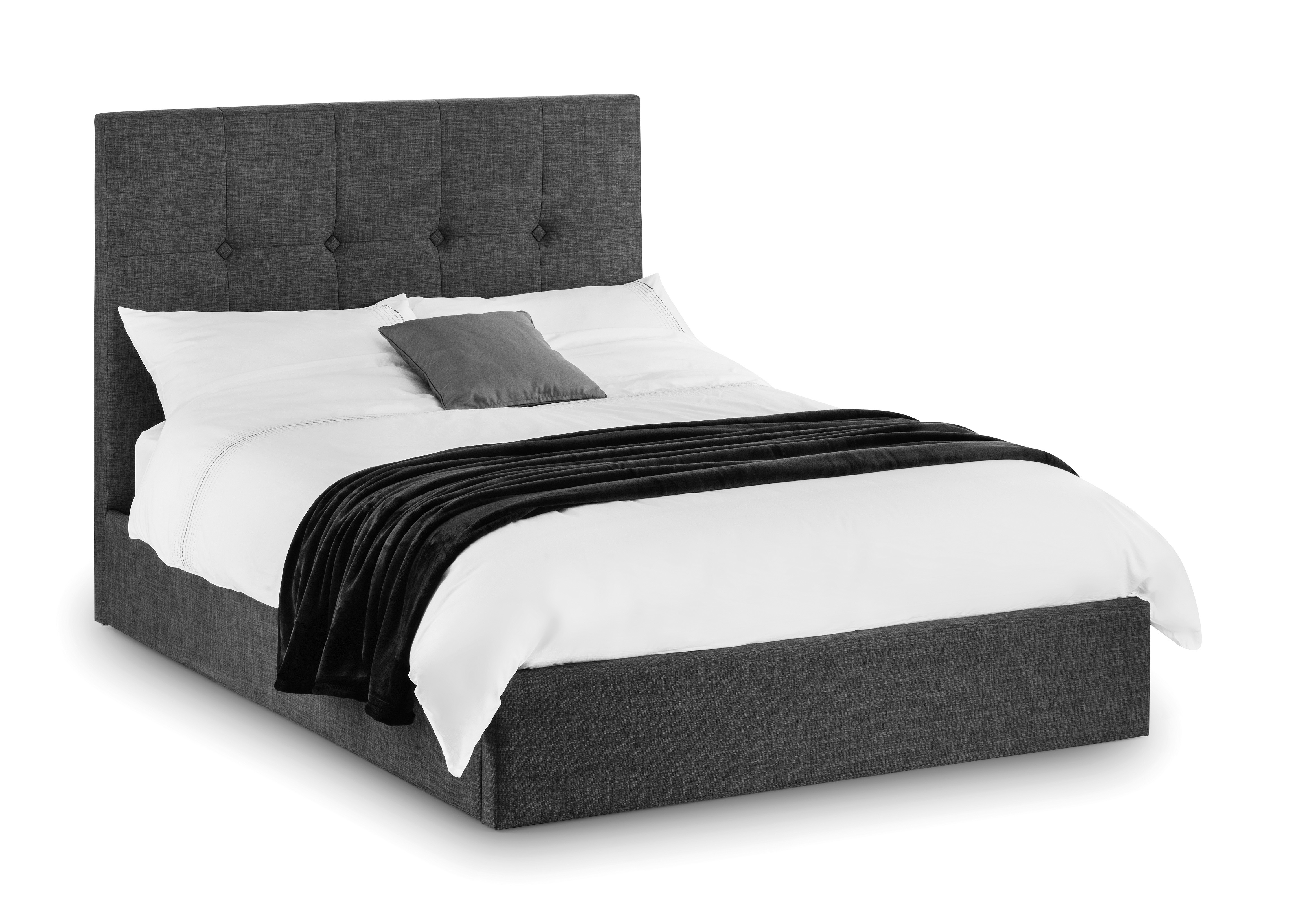 Sorrento king size lift-up storage bed is a stunning choice with a beautifully upholstered frame in a sophisticated slate grey linen. With a contemporary style and immaculately finished with diamond shaped feature buttoning which makes an impressive style statement. While a gas-powered lift-up Ottoman offers a fantastic amount of storage space. A sprung slatted base ensures a good night's sleep and prolonged mattress life. Size: D214.5 x W161 x H121cm Mattress sold separately.