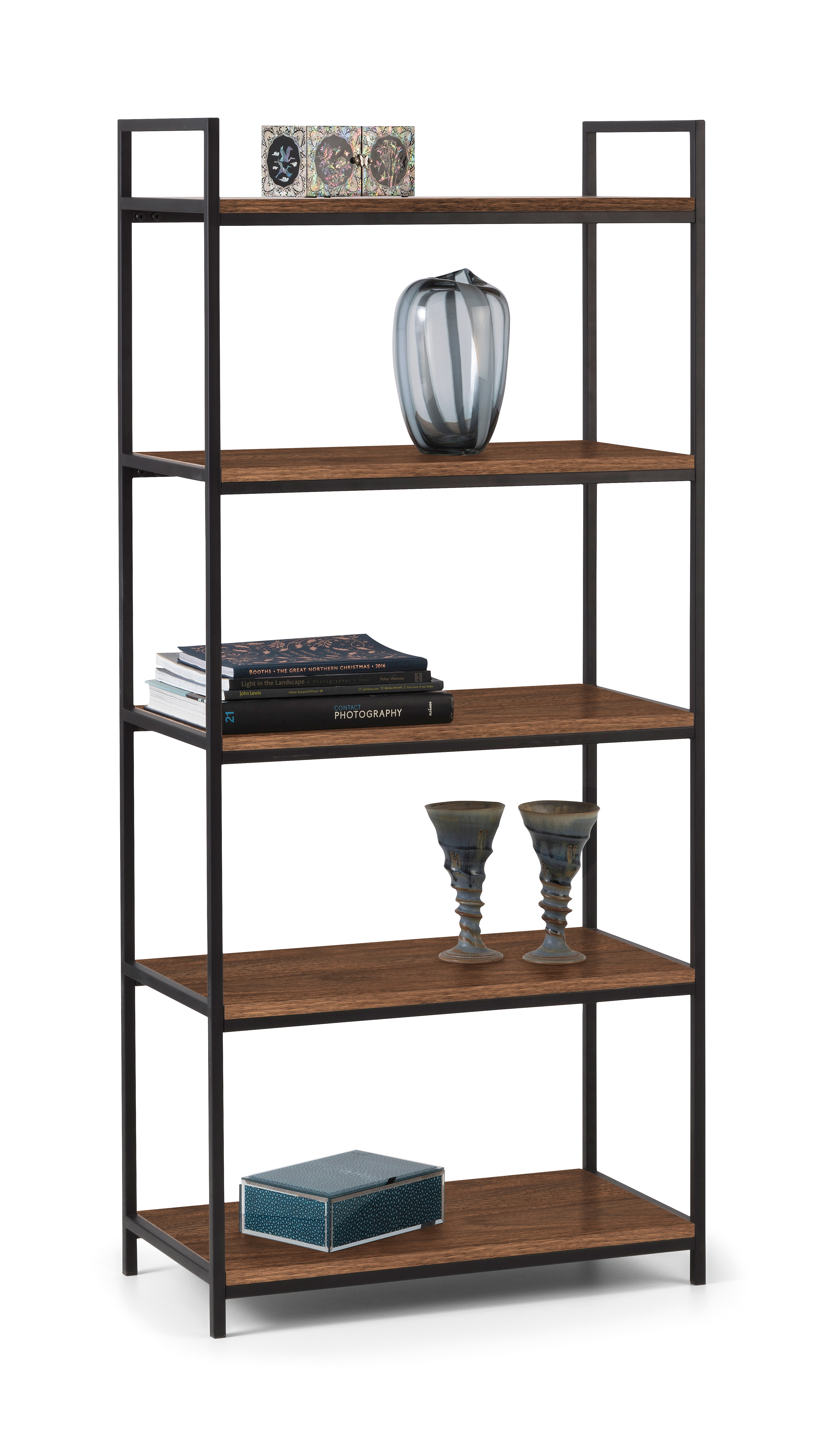 A cool, modern tall bookcase designed to add a contemporary touch to any home or work place. Its simple clean lines, delineated by a subtle, black coated metal frame are complemented perfectly by a warm, walnut foil, to create a very stylish and sleek product.