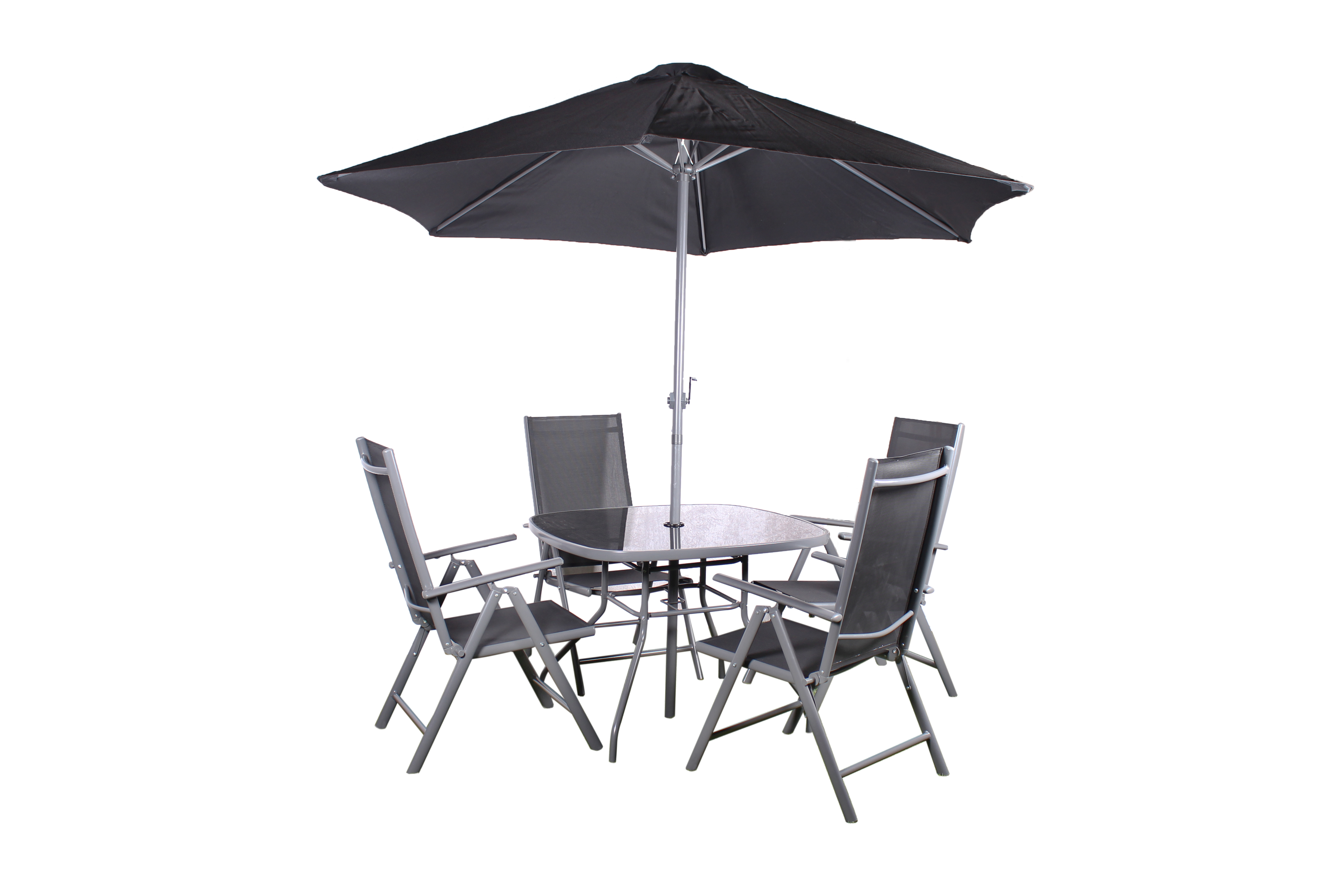 The Rio collection is stylish, practical and virtually maintenance free with it’s high grade all weather textylene fabric. Features: Material: Powder coated steel Frame Colour: Grey Textylene Colour: Black Modern and contemporary design Recliner chairs fold away for easy storage Parasol included The set includes: 1 x Square Table with tempered safety glass 4 x Recliner textylene chairs 1 x 2.4 meter parasol with black canopy Dimensions: Table – H70cm W96.5cm D96.5cm Chairs – H96cm W55cm D71cm Parasol – H220cm W240cm D240cm Care Instruction To extend the product life and appearance, we strongly advise using a protective furniture cover during Autumn and Winter months and also during adverse weather conditions.