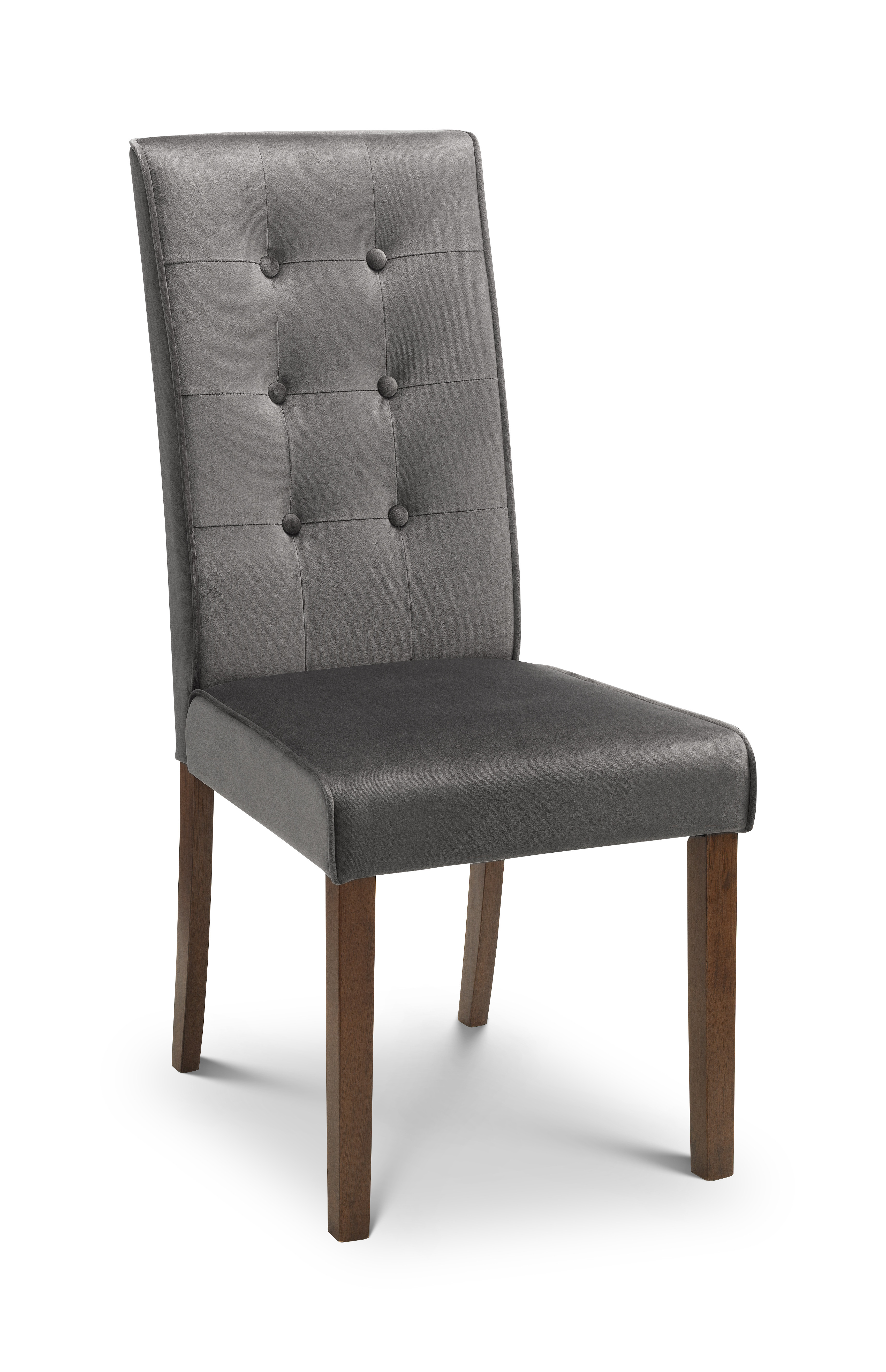 Upholstered in luxurious grey velvet, the Madrid dining chair adds a touch of class to any room. Featuring a high tufted back and walnut coloured legs, this dining chair is suitable for a variety of dining tables and décor. Size: D63.5 x W41 x H103cm