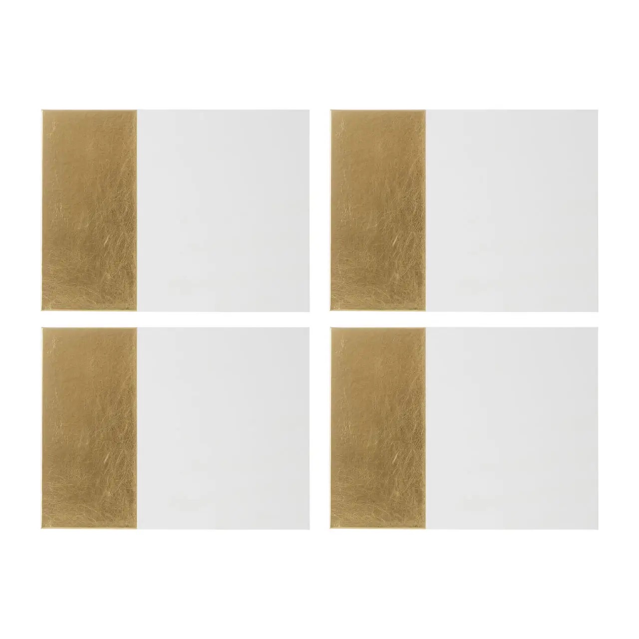 Their asymmetric white and gold colour scheme make these placemats reflective accent pieces for the dinner table. The crisp white contrasts with the reflective gold, the latter's veined surface lending each one texture. These contemporary heat resistant mats are presented in bespoke bow wrapping, making them highly giftable.
