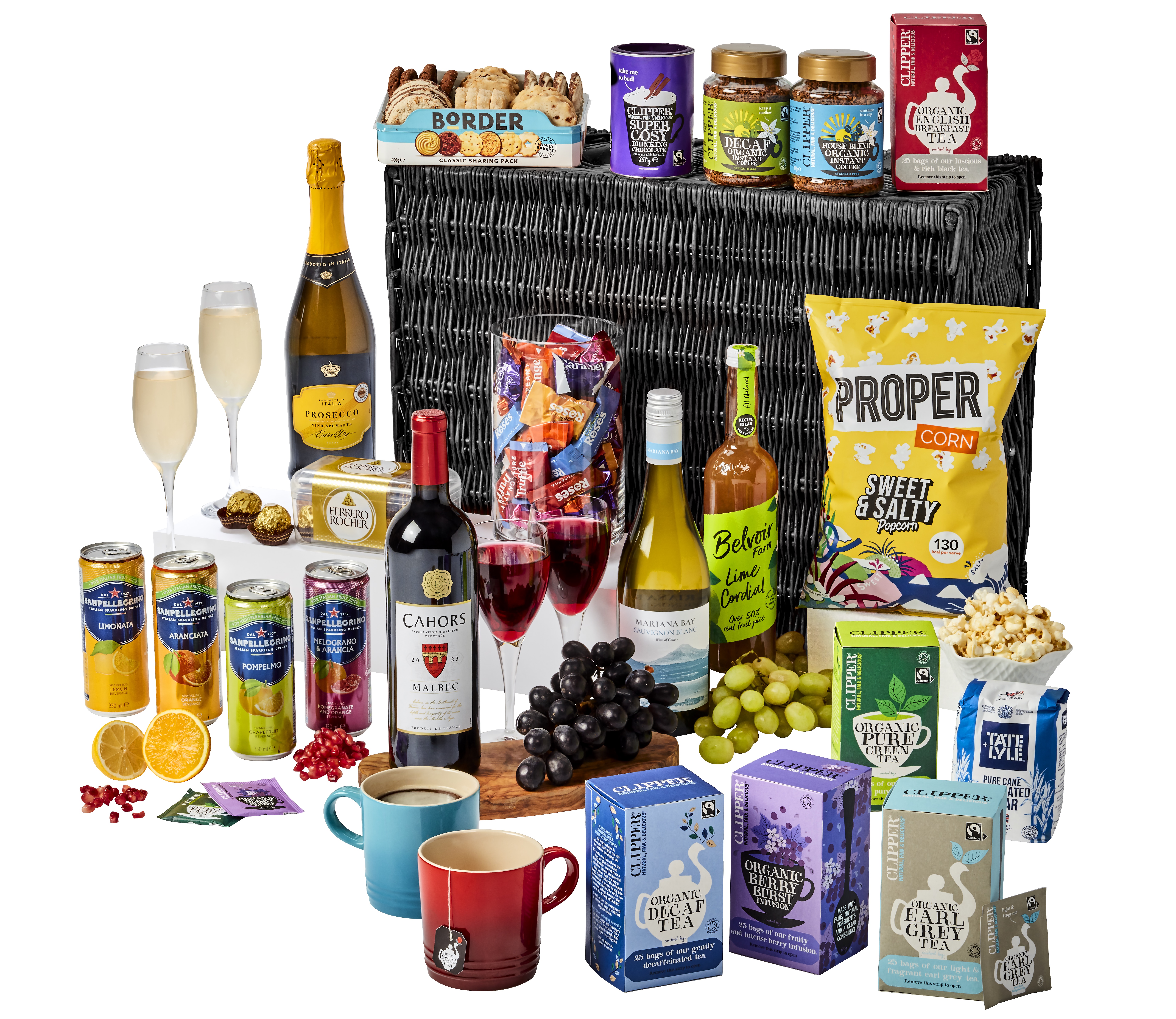 The ultimate expression of luxury. The Prestige Hamper showcases exclusive, top-tier products in refined packaging, crafted for milestone moments, executive gifts, and unforgettable gestures. Pack Contents Include: 1 x Clipper English Breakfast 25 Tea Bags 1 x Clipper Decaf 25 Tea Bags 1 x Clipper Earl Grey 25 Tea Bags 1 x Clipper Green Tea 25 Tea Bags 1 x Clipper Berry Burst 25 Tea Bag 1 x Clipper House Blend Coffee Pot 100g 1 x Clipper Decaf Instant Coffee 100g 1 x Clipper Drinking Chocolate 250g 1 x White Granulated Sugar 500g 1 x Border Biscuits Sharing Pack 400g 1 x Butterkist Popcorn 100g 1 x Cadbury Roses Chocolates 290g 1 x Ferrero Rocher 16 Chocolates 200g 4 x San Pellegrino Flavoured Cans 330ml 1 x Belvoir Cordial Drink 750ml 1 x Calvet Sauvignon Blanc 750ml 1 x Calvet Cahors Malbec 750ml 1 x Yellow Tail Prosecco 750ml 1 x Black Wicker Hamper Basket & Liner
