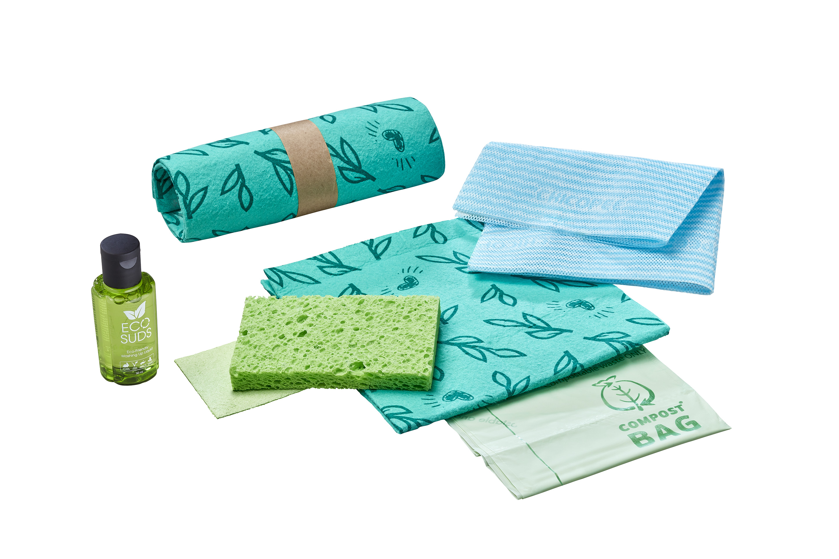 Make your guests experience stand out from the moment they arrive, with our thoughtfully designed Welcome Pack. This pack includes a selection of essential products, guaranteeing a hassle-free experience for both your guests needs and those of a busy accommodation supplier. Pack Contents Include: 1 x Viscose Compostable Cloth, 1 x Chicopee Compostable J Cloth, 1 x Compostable Pop Up Sponge, 1 x Washing Up Liquid 30ml, 1 x Biodegradeable Refuse Sack 20kg and 1 x Kraft Banded Strip.