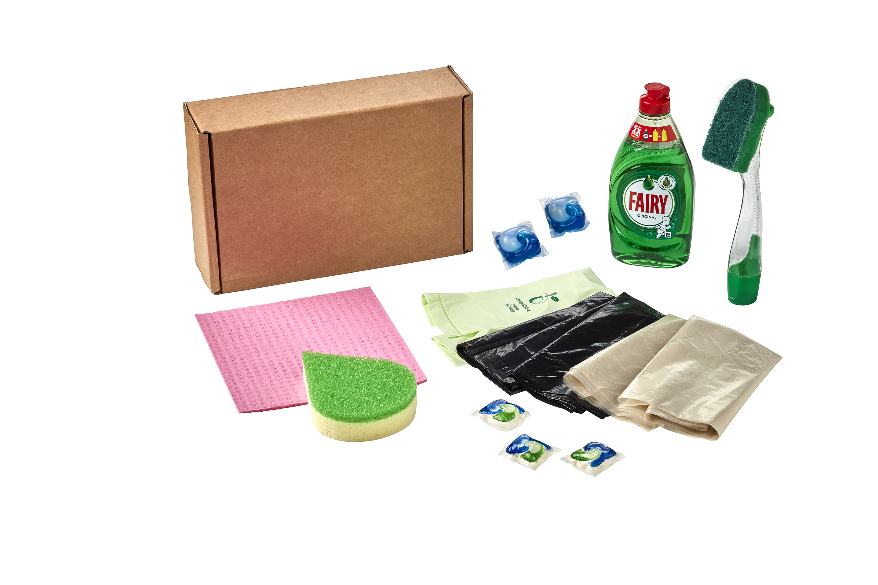 A high-tier pack loaded with premium additions. Powerful cleaning performance with a luxurious feel — ideal for users who love the best of Fairy’s gentle strength. Pack Contents Include:1 x Fairy Cellulose Cloth 1 x Fairy Max Power 2 in 1 Scrubber Sponge 1 x Fairy Soap Dispensing Dish Brush 1 x Fairy Original Washing Up Liquid 320ml 3 x Fairy Original Dishwasher Tablets 2 x Fairy Laundry Detergent Pods 1 x Biodegradable Refuse Sack approx 20kg 1 x Black Heavy Duty Refuse Sacks approx 15kg 1 x Clear Refuse Heavy Duty Sacks approx 15kg 1 x Large Kraft Tuck in Flaps Box