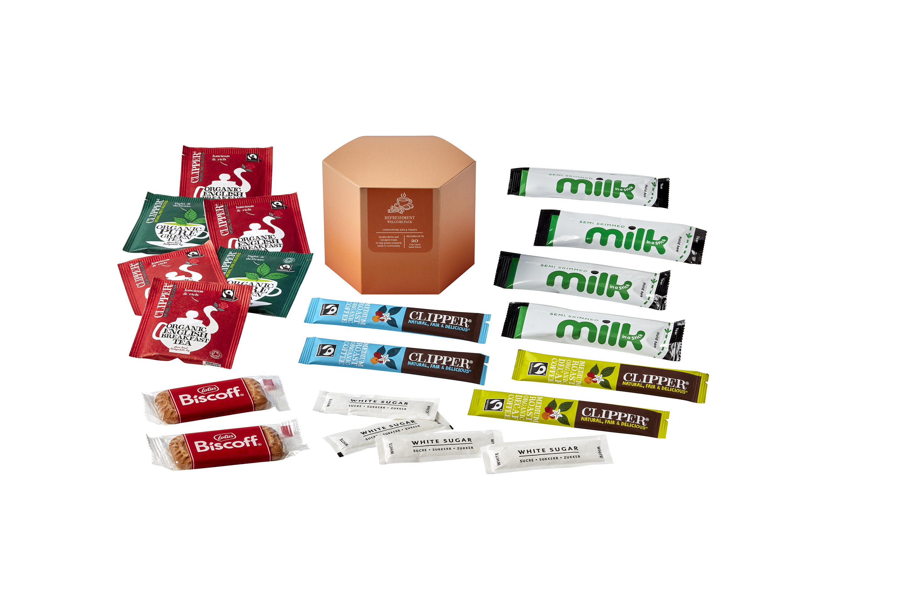 Make every guest arrival a memorable experience with the Polygon Premium Refreshment Box — a sophisticated collection of high-quality beverages and gourmet treats designed for ultimate indulgence. Perfectly suited for luxury hotels, executive apartments, corporate suites, and upscale short-term rentals, this premium box offers a refined welcome that immediately impresses. Elegantly packaged and carefully curated, the Polygon Premium Refreshment Box combines convenience with style, providing guests with a selection of refreshments to relax, refresh, and enjoy from the moment they arrive. It’s more than just a welcome — it’s a statement of thoughtful hospitality. Pack Contents Include: 4 x Clipper English Breakfast Tea Bags 2 x Clipper Green Tea Tea Bags 2 x Clipper Coffee Sticks 2 x Clipper Decaff Coffee Sticks 4 x White Sugar Sticks 4 x Milk Sticks 2 x Lotus Biscoff Individual Biscuits 1 x Polygon Small Box
