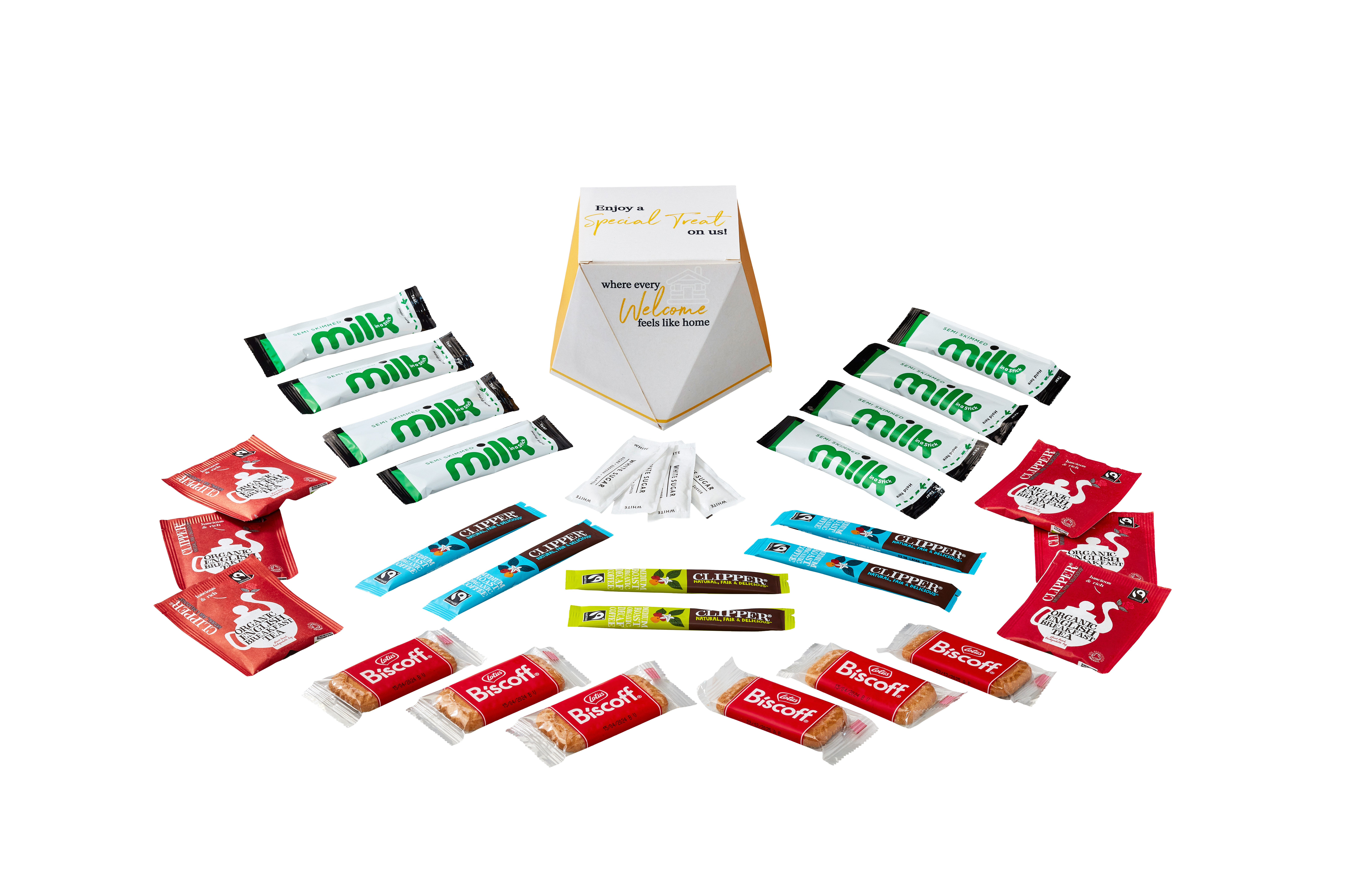 Make your guests experience stand out from the moment they arrive, with our thoughtfully designed Welcome Pack. This pack includes a selection of essential products, guaranteeing a hassle-free experience for both your guests needs and those of a busy accommodation supplier. Pack Contents Include: 6 x Clipper English Breakfast Tea Bags 4 x Clipper Coffee Sachets 2 x Clipper Decaffeinated Coffee Sachets 4 x White Sugar Sticks 8 x Milk Sticks 6 x Caramelised Biscuits Individually Wrapped 1 x Faceted Half Size Box