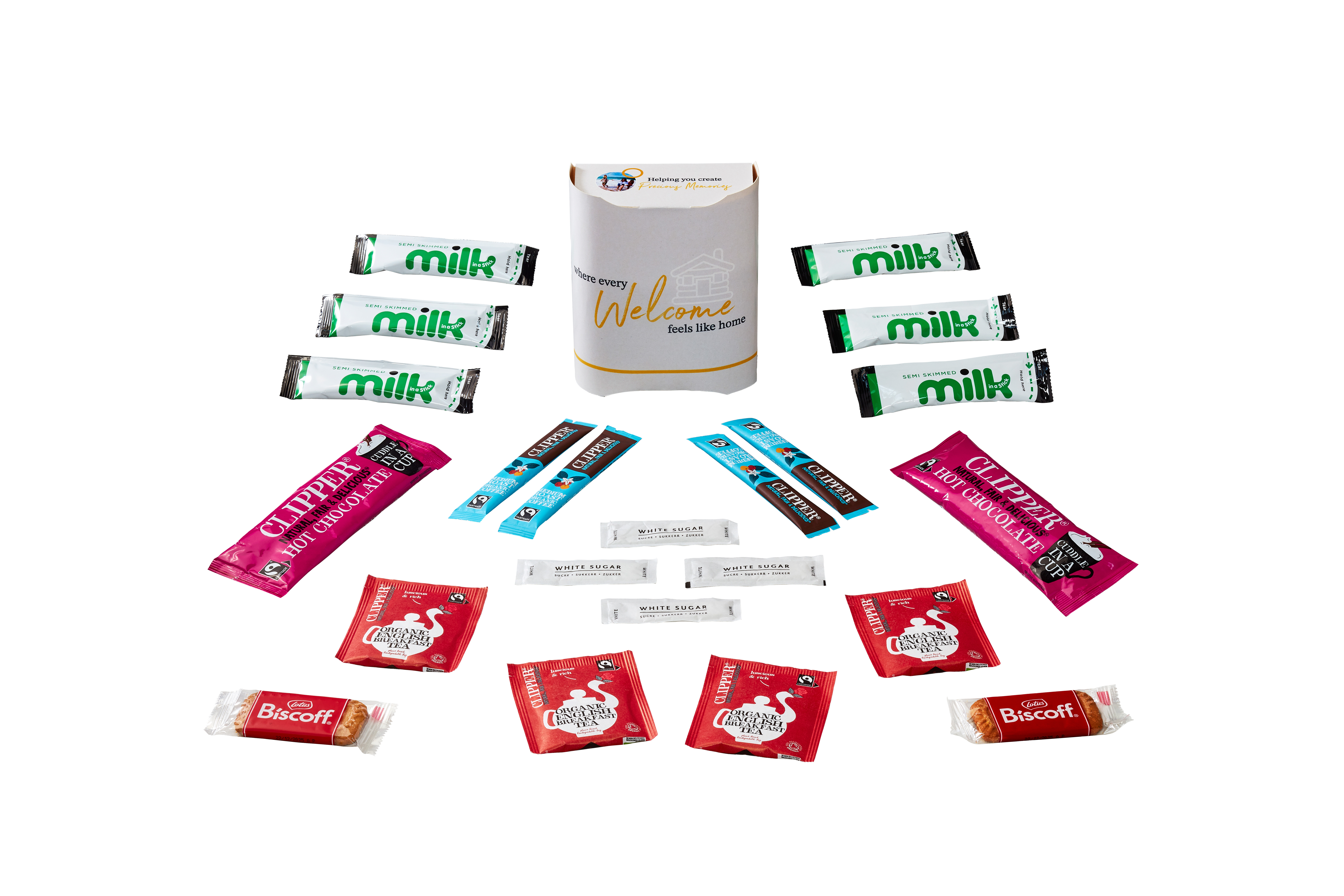 Make your guests experience stand out from the moment they arrive, with our thoughtfully designed Welcome Pack. This pack includes a selection of essential products, guaranteeing a hassle-free experience for both your guests needs and those of a busy accommodation supplier. Pack Contents Include: 4 x Clipper English Breakfast Tea Bags 4 x Clipper Coffee Sachets 2 x Clipper Hot Chocolate Sachet 4 x White Sugar Sticks 6 x Milk Sticks 2 x Caramelised Biscuits Individually Wrapped 1 x Tunnel Box